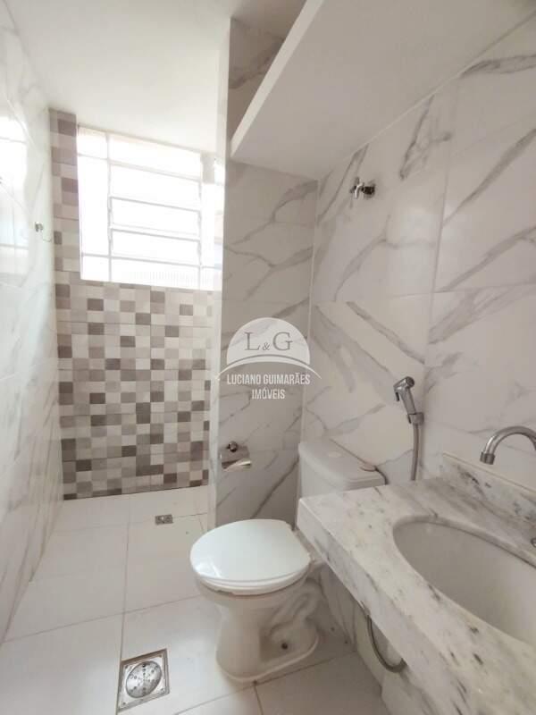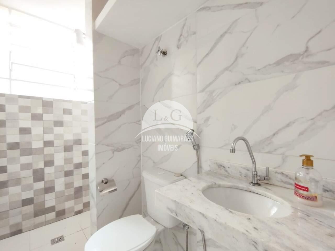 - Banho, piso em porcelanato e bancada em mármore.