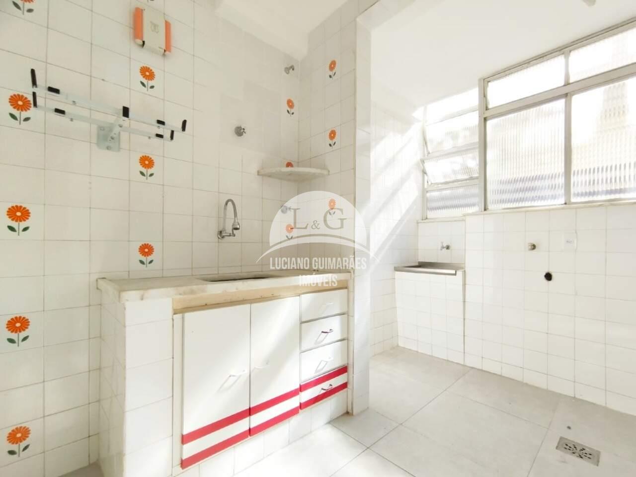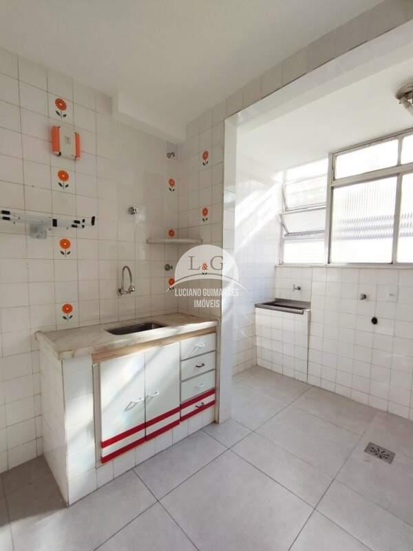 - Cozinha, piso em porcelanato, bancada em mármore e armário sob bancada.